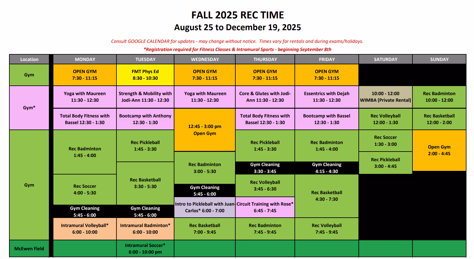 The Stewart Athletic Complex features a gymnasium, Fitness Centre, locker rooms and Smart Workout Studios. We also have two outdoor fields (Watson and McEwen), outdoor gym and an outdoor sand volleyball court.